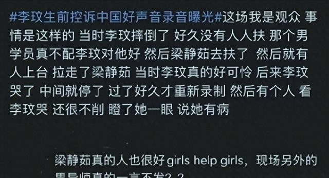 去年十月,李玟把跟节目有关的微博都给删了,当时这事儿还挺火的,后来就慢慢没声了。最近出的那个录音,跟李玟之前在节目里发火那事儿对上了。